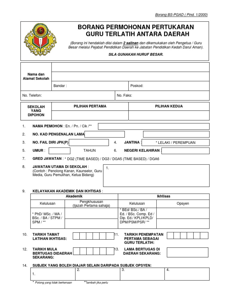 Borang Permohonan Pertukaran Guru Terlatih Antara Daerah Borang Bs Pgad Pind 1 2000
